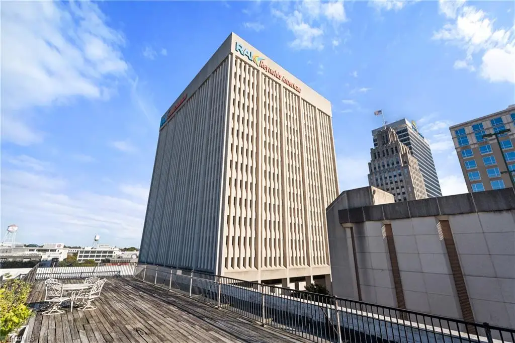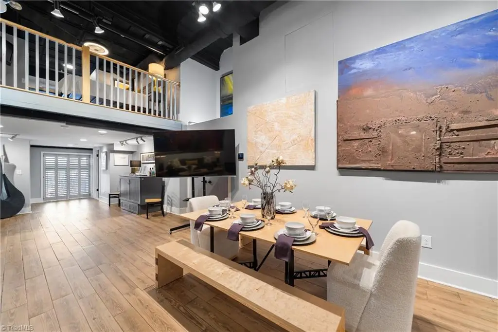Exciting urban living comes to life in this beautifully proportioned New York-style loft with new (2025) oversized east-facing windows, original 16-foot tall tin ceilings and a private parking space — located in the heart of downtown Winston-Salem within a vintage department store building dating to 1925; Granite/stainless steel kitchen with bar-style seating; Massive great room for living and dining; East-side loft caters exclusively to the primary suite with private bathroom and sitting area; West-side loft offers versatile home office/living space; Main-level flex room (behind kitchen) can serve as a second bedroom — complete with Murphy bed; Convenient main-level laundry; The One West Fifth building housed the Charles Department Store for decades and was redeveloped into condominiums in 2003 — and features a charming lobby with original grand staircase leading up to a mezzanine-level common area; Note that the 2 areas below the lofts have ceiling heights slightly below 7-ft.